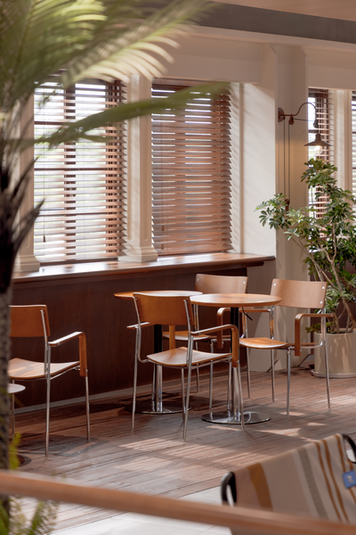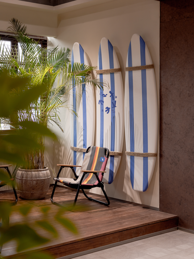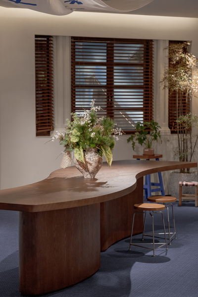 空间同时作为策展区,可以灵动陈设展品。开放而不设置太多墙体隔断的空间,最大程度塑造流动感。木质家具带来的质朴与自然气息,百叶窗里透漏出的慵懒光阴,整体空间向外传递回品牌基调:在海边,宽宽来。