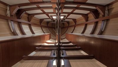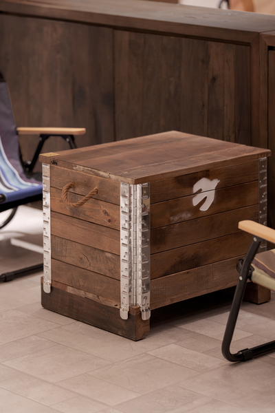 室内首层空间以开放式200㎡平层,模拟船舱卸货场景。设计将船的形态置入、上升至天花板,以老船木仿制构件与船骨天花构成空间基底,让人如步入船舱般身临其境,沉浸感受空间的航海叙事。
