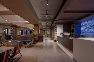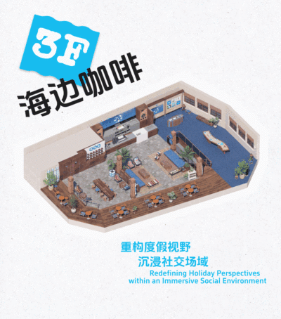 拾级而上,三层空间引入「海边咖啡」子品牌营造船的最顶层甲板之上放松度假,自在社交的生活氛围,设计将甲板上流动的风、阳光、海浪等意象融入空间,以更具包容性的航海叙事体现场景的流动感与人文性,呼应"开放通透"的空间哲学基定独栋骑楼的总体设计语言与空间气质。