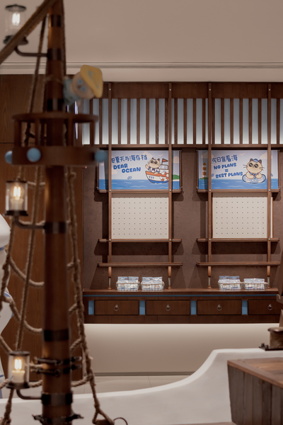 相较一楼热闹往来的人气与琳琅满目的陈列,二层空间以“海上船屋”为意象,表达慢下来的空间节奏。开放的空间形态,与轻松温馨的氛围让人慢下步伐,能更加沉浸感受航海船屋里的主题游逛。