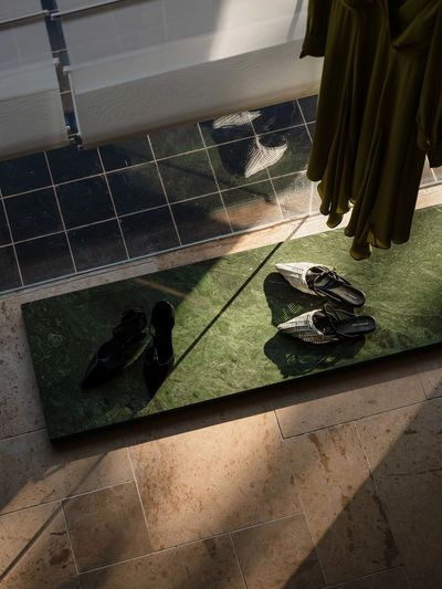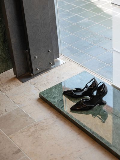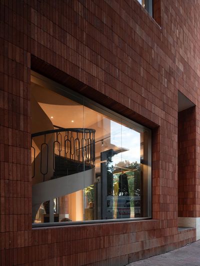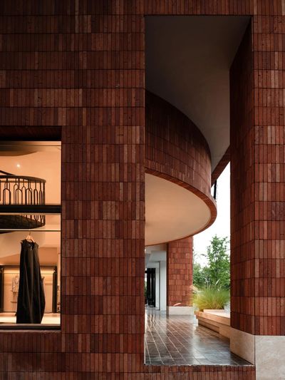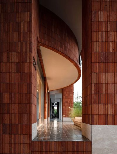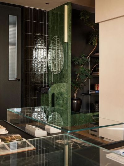 主要材料:幻彩绿石材、莱姆石、红砖贴片,雾面不锈钢、黑色树瘤木皮、艺术涂料,木地板等