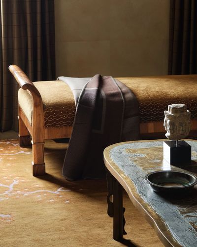 Farmer习惯以地毯定调——客厅的金棕色地毯,镶嵌着银与铜的有机纹理,仿佛在地面上延展出金属光影的流动。餐厅与书房则以宝石色调呼应,赋予空间多层次的色彩张力。