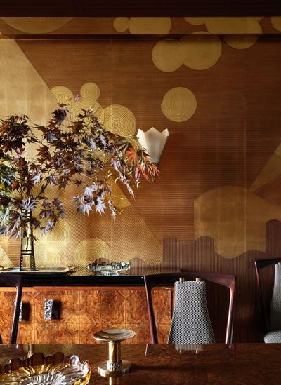 餐厅无疑是高潮。定制的 de Gournay 金箔壁纸,交织漩涡与锐角线条,源自帝国日本的艺术语汇,又融入Jean Dunand的装饰语言。灯具来自上世纪三十年代的意大利,餐桌与椅子在法式与中世纪现代之间游走。空间在复古与摩登的张力下,仿佛镀上了一层黄金的薄雾。
