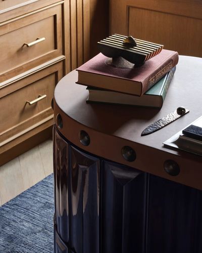Farmer likes to set the tone with a rug—here, a golden-brown carpet interlaced with silver and copper patterns flows like liquid light across the living room floor. The dining room and study echo this with jewel-toned hues, infusing the home with layered chromatic depth.