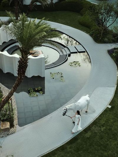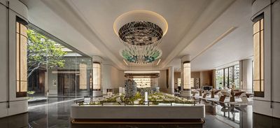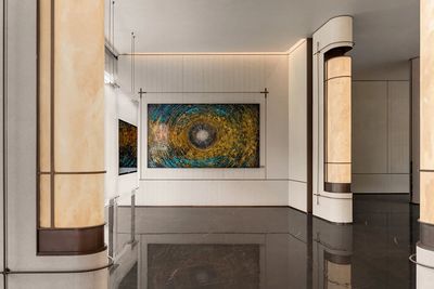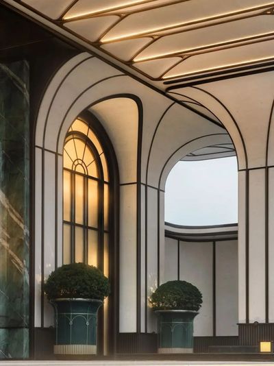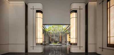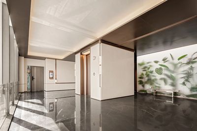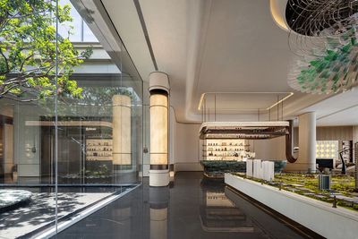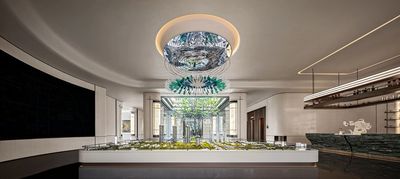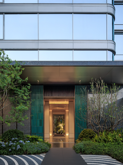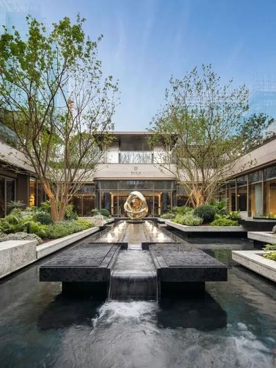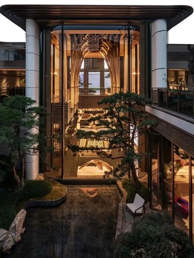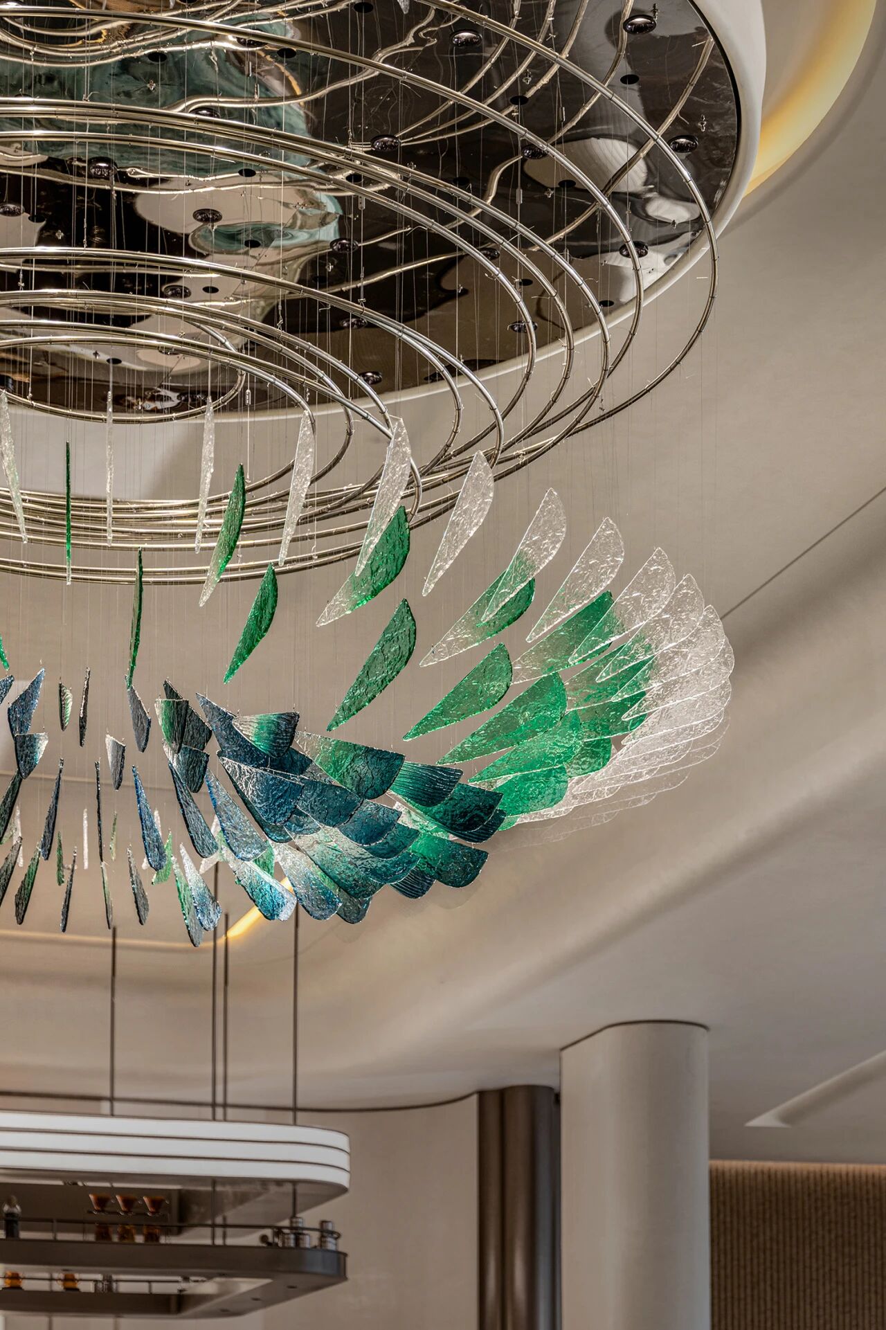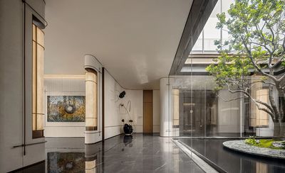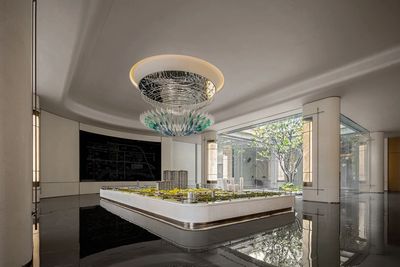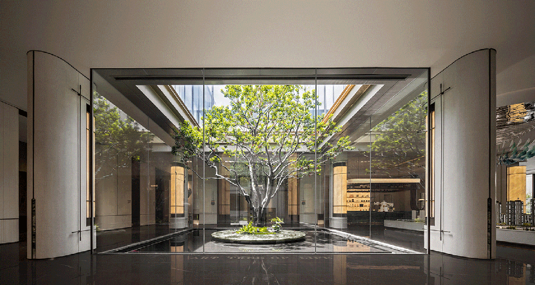 生命之树置于中庭轴线之上作为精神象征核心,超大面积玻璃墙 弧形石材柱,构建通透又具仪式感的 “盒子空间”,把中庭变成 “可透视的生态展品”;顶部引入自然光,让树的光影随时间变化,赋予空间 “动态生命力”,打破室内外边界;自然、光影、静谧的氛围,让客户产生 “放松、向往” 的情绪,拉近与 “未来理想生活” 的距离。