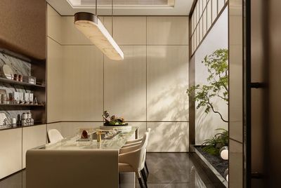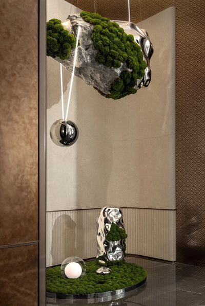 浅米色肌理材质 金属收边,传递 “柔和、高级” 的质感,平衡 “东方意境” 的质朴与 “现代生活” 的精致;引入 “室内微景观” 松树、苔藓、砾石 ,把 “自然生态” 搬进生活空间,强化 “自然雅趣”。