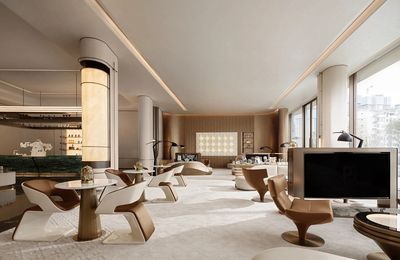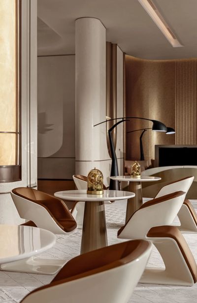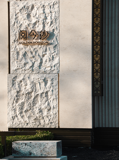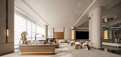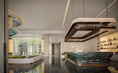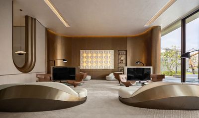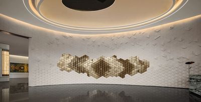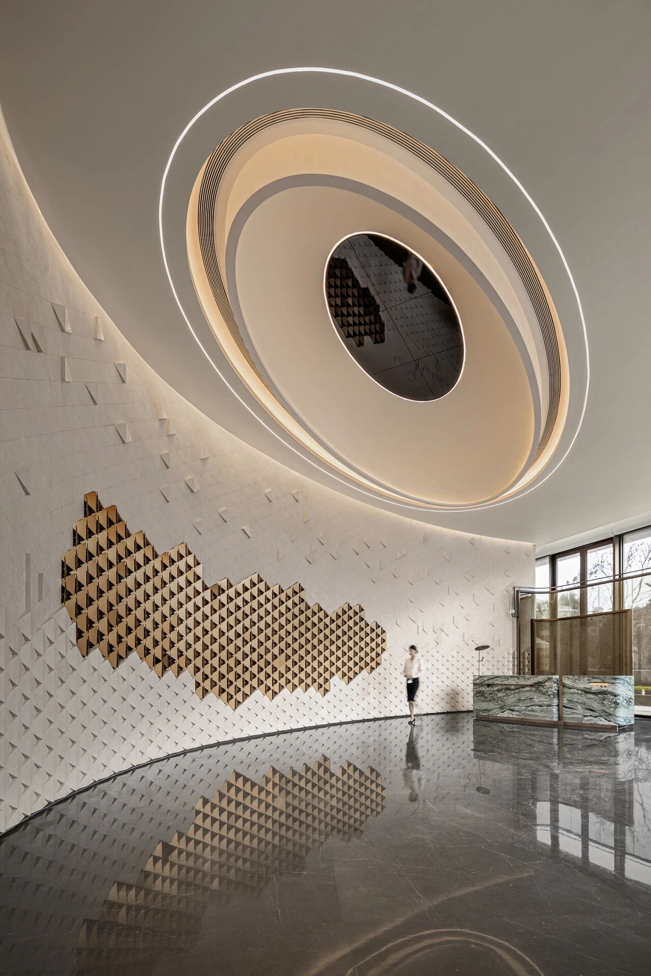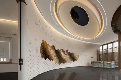 接待前厅5米挑高的弧形空间,营造出柔和且富有张力的空间感引导视觉流动,墙面定制雕刻几何拼接石材如山水脉络起伏,用现代手法演绎山水意境,传递项目 “文化底蕴”。墙面嵌入几何模块互动装置,通过重复、错落、渐变,让 “品牌符号” 从平面走向立体,成为空间里的 “动态文化标识”;把 LOGO 转化为独特艺术装置,让 “品牌识别” 跳出传统标识,变成 “空间记忆点”。