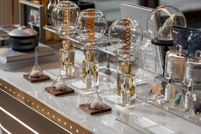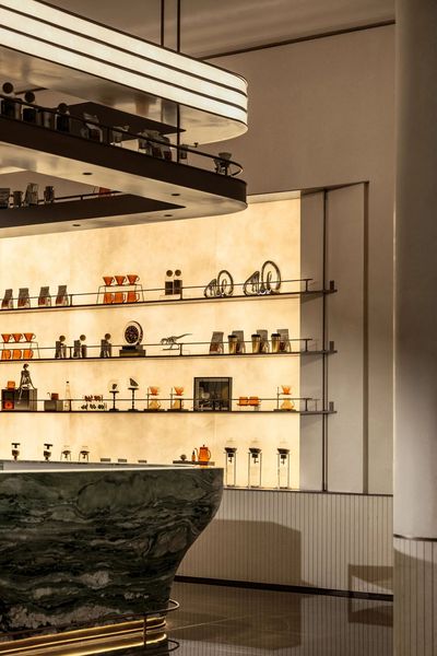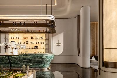 水吧区采用超大体量的弧形设计,线条流畅自然,赋予空间灵动与柔和之感。选用维多利亚绿奢石,其独特的纹理和浓郁的色彩极具视觉冲击力,彰显出奢华与高贵的气质。背景透光云石,在灯光的照射下,散发出柔和且均匀的光线,不仅丰富了空间的层次感,还营造出温馨、舒适的氛围,与绿奢石形成对比又相得益彰 。