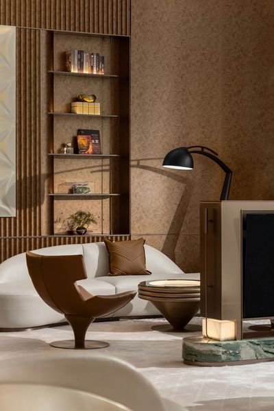 作为智慧交互未来生活预演场,重构人、自然与科技的关系。洽谈区每组沙发设有独立的VR一体机,社区蓝图在眼前立体生长用数媒辅助决策买单。背景墙的竖向纹理犹如层叠山脊,也似涌动的波涛,仿佛蕴含着无尽的力量,在静态的空间中营造出一种动态的韵律感。