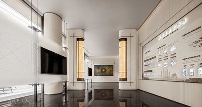 九大价值展示区以对称式布局构建秩序感,灯柱、展示屏等元素左右呼应,引导视线聚焦后方抽象艺术画,既是空间视觉终点,也隐喻 “未来生活的美好想象”,用艺术感强化 “价值认同”;几何纹理亚克力透光展框,既呈现内容,又不阻断视线,保持 “开放感” 的同时,强化 “品质细节”。