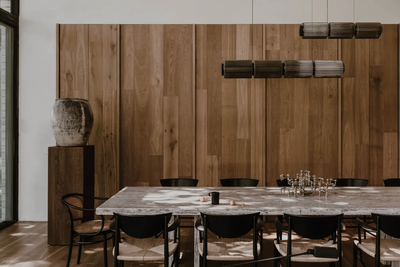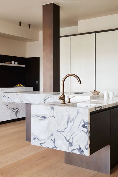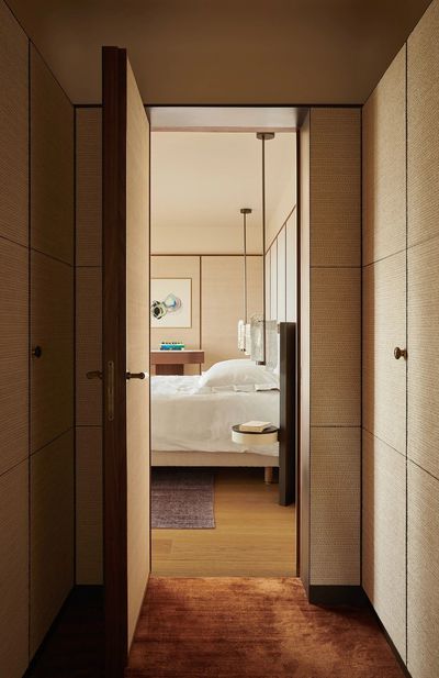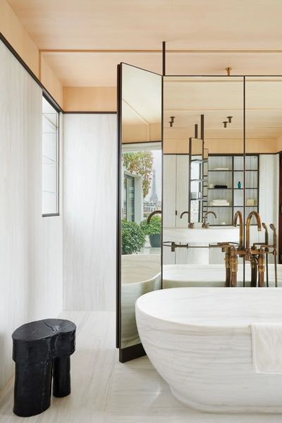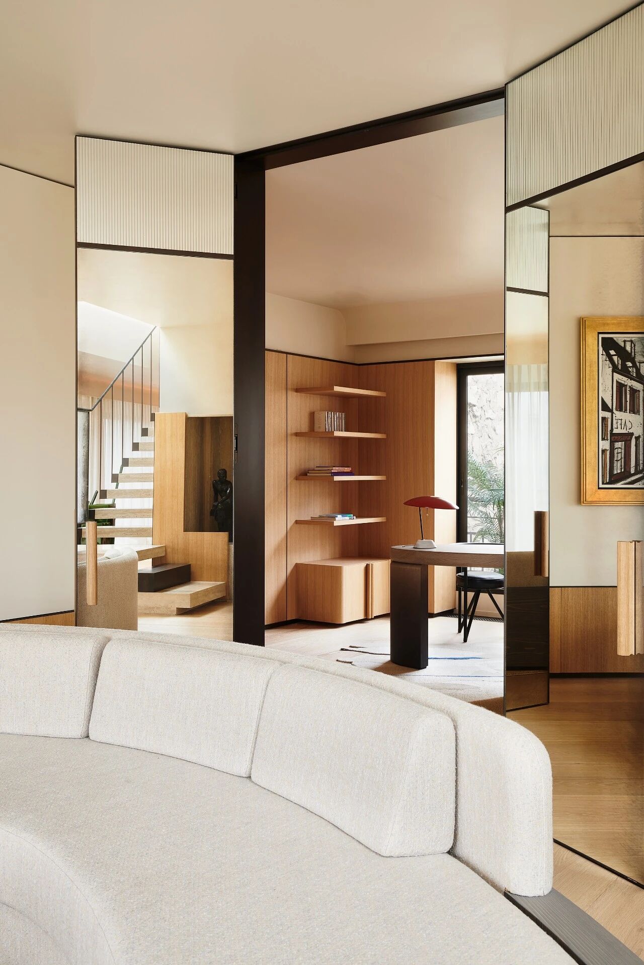 这个宛若庄严盒子的空间,被柔和的光线轻抚,呈现出极具建筑感的氛围。他带着深厚的专业修养与工匠精神进入设计现场:手刷的木材、带有肌理的青铜、经手工锤打的金属,以及那些未经机器打磨的天然石块——这些都构成了他眼中“真实”的表达。