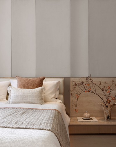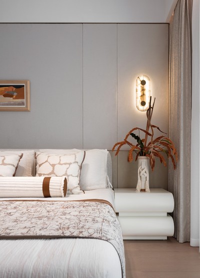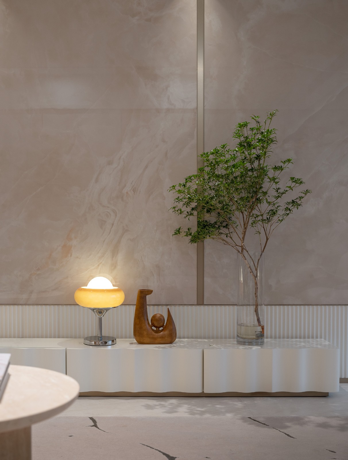 整体以素净优雅的奶白为空间基调,摒弃繁复、多彩的装饰陈设,以此来统一视觉感受。素白之中勾勒舒缓木色,愈发透出自然亲和的气质。在简约清雅的空间氛围之中,所有的装饰都变得新鲜生动,一点绿意稍带点缀便可唤起勃勃生机。