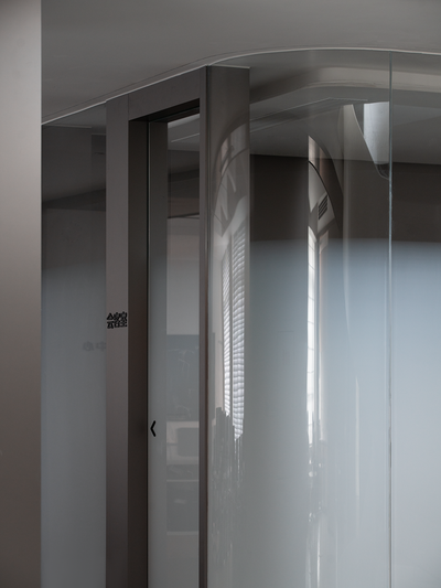 在楼梯的考量上希望弧线形体能够成为空间的点睛之笔,也需要有轻盈的感官,在一侧用了更通透的玻璃栏杆,消解笨重的感受。