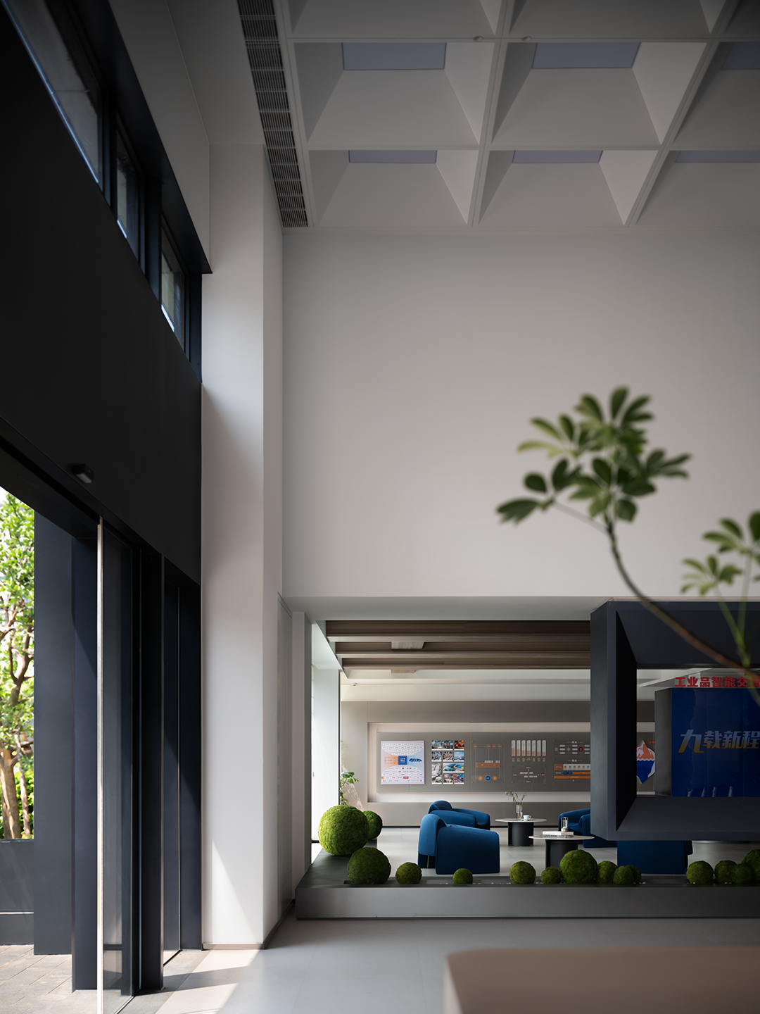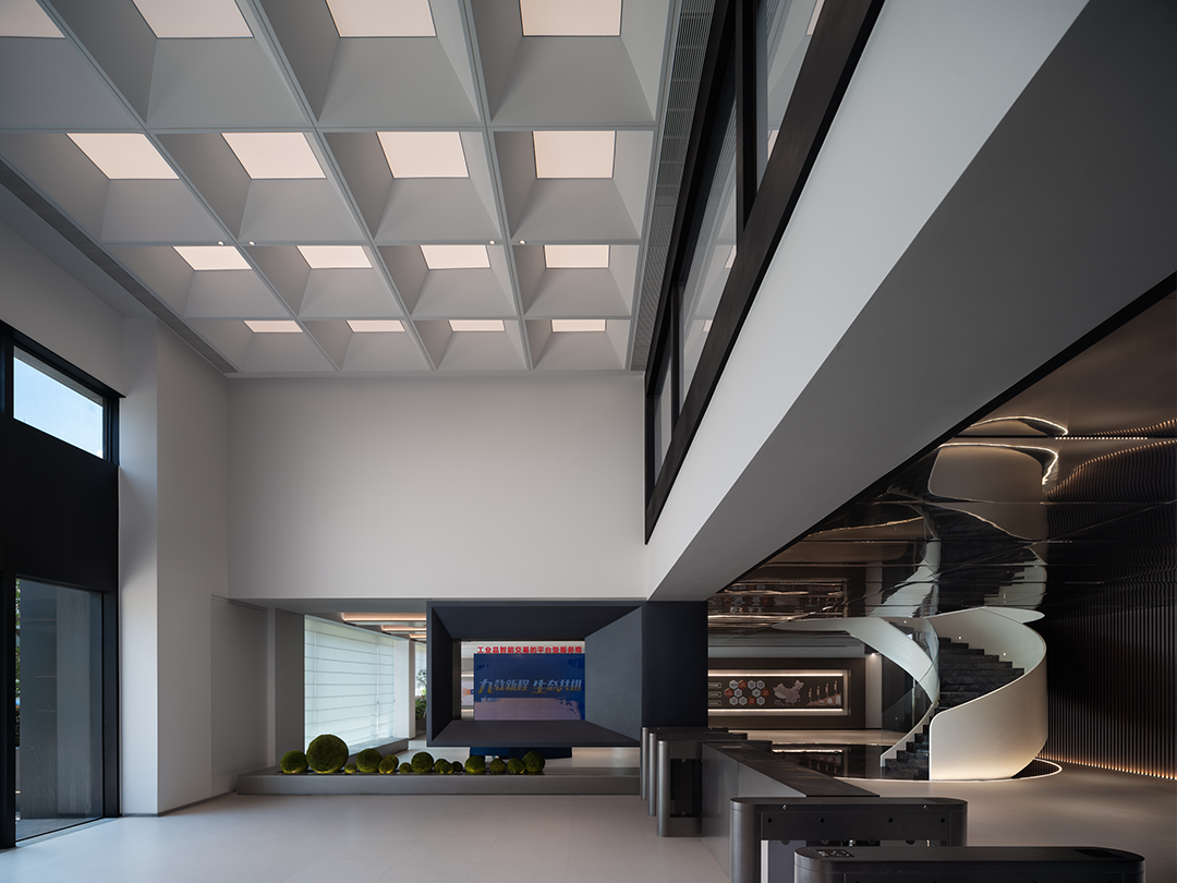 利用几何块面增强空间的结构感和秩序感,在挑空上方的方盒子中置入渐变玻璃,为夹层办公区域释放更多的自然光感。