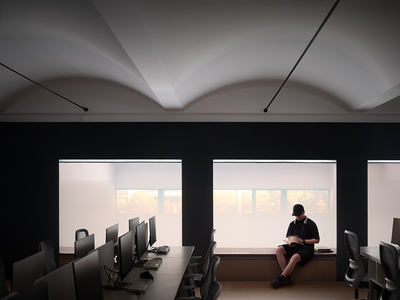 夹层的使用区域,利用拱券尽量提高空间层高,在配色和材质选择上,用到更多浅色调和木纹色做结合,希望传递舒适、明朗的办公氛围。