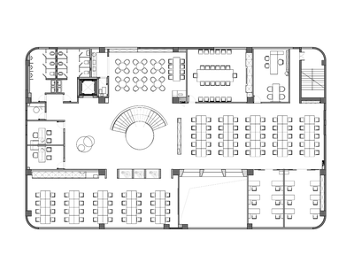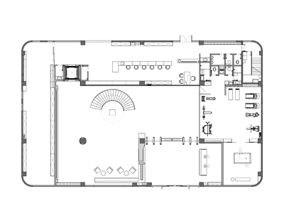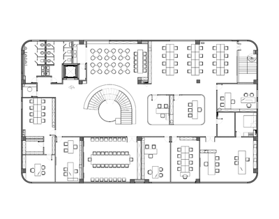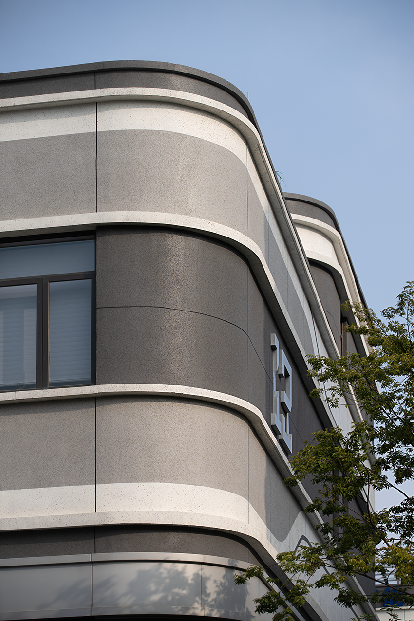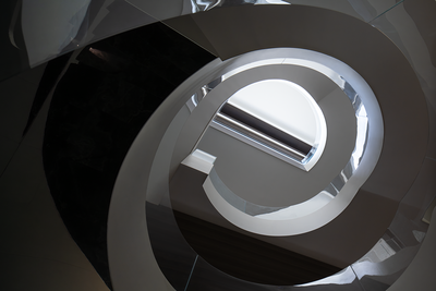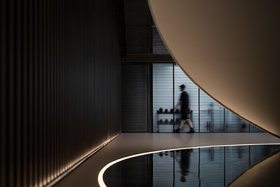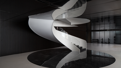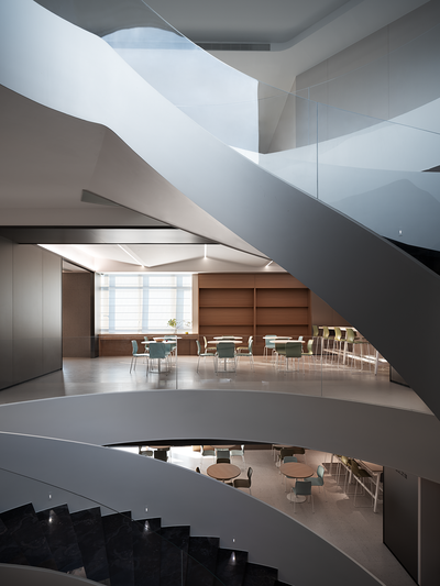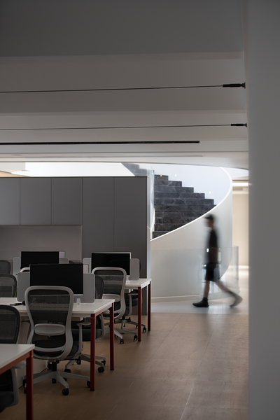 整个楼栋通过旋转楼梯贯穿,弧线的形体置入空间中,丰富空间的层次的同时引导动线导向。