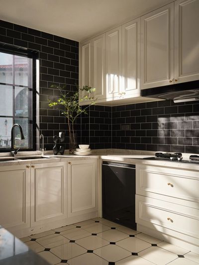 餐厨区采用开放式布局,与客厅通过一道优美的拱形门洞相连。做旧橱柜,像是地中海的波浪轻轻拍打海岸。手工彩绘瓷砖上是几何与花卉的交织,仿佛毕加索笔下的线条与色彩,在烟火气中重生。