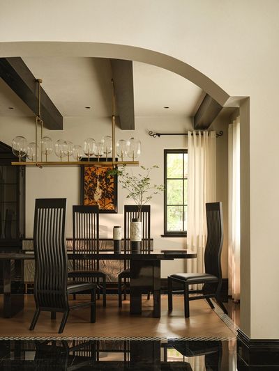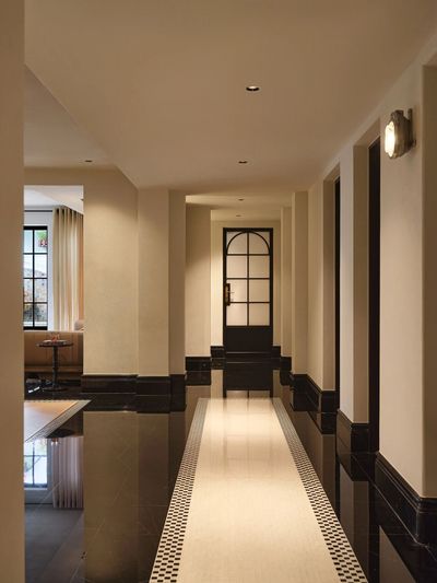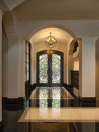 黑白拼花地砖如琴键般铺展,迎接归家的第一步。墙面艺术漆,搭配做旧金属壁灯,在光影交错中书写第一首欢迎诗。拱形门洞将视线引向深处,空间叙事由此展开。
