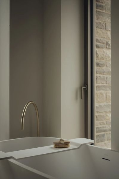 The floors are connected by a stair hall which stands in the south side of the plan. Enclosed by a glazed elevation, the hall is protected from the summer sun by angled oak timber, offering a break in the stone facade of the home. A bespoke oak staircase links the levels, with floating treads which allow light to filter into the stair hall.