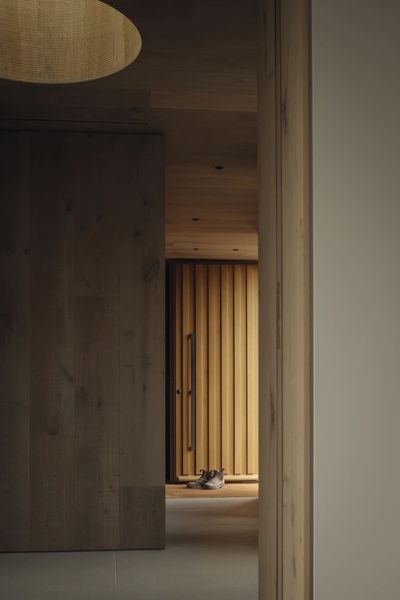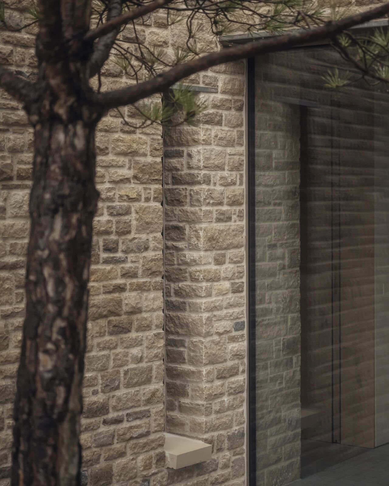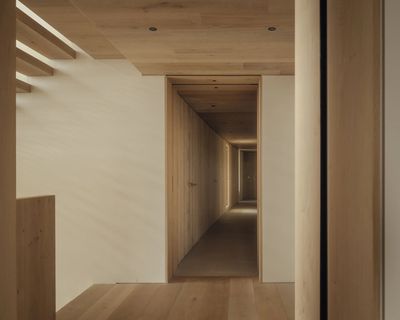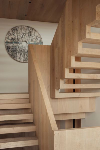 住宅各层由南侧的楼梯厅相连,空间由玻璃立面围合,并以倾斜的橡木遮阳抵御夏季烈日,在石材立面上形成轻盈的开口。定制的橡木楼梯贯穿上下楼层,悬浮踏板让光线自由渗入,使楼梯厅在垂直动线上充满明亮与通透感。