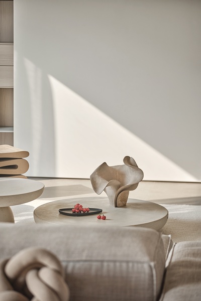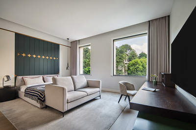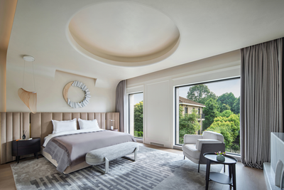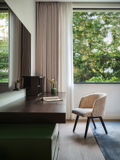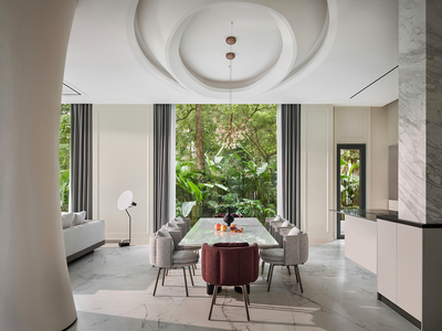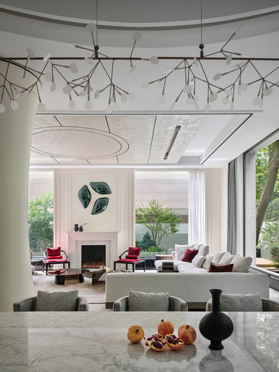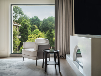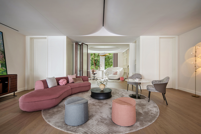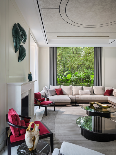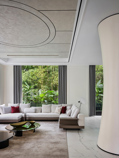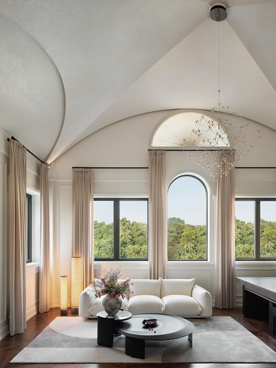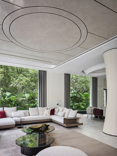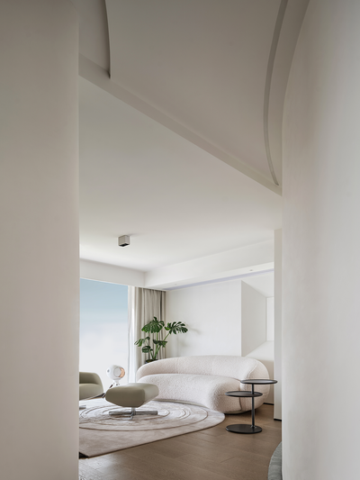 大面积落地窗将室外绿意引入室内,与室内柔和的色调和家具的曲线相融合,共同构建出一个清新、明亮且充满诗意的环境。