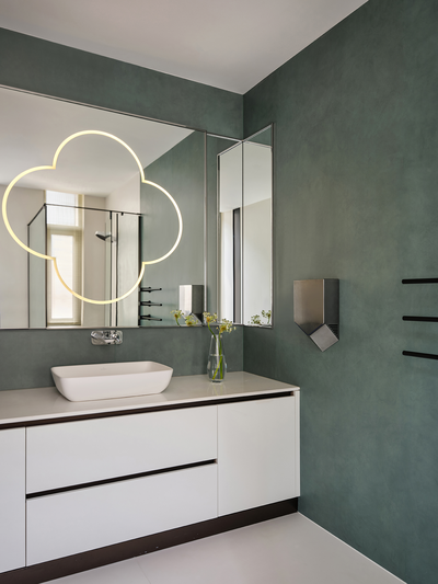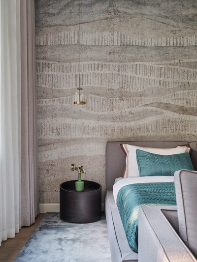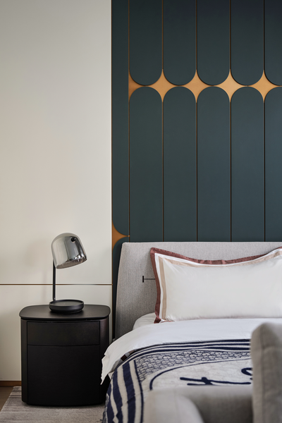 第二间老人房的布局与第一间老人房一致,体现出对双方老人居住的尊重和平衡。在细节设计上略作区分,用墨绿色的几何纹样突出宁谧氛围。