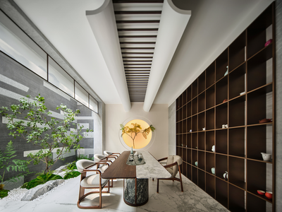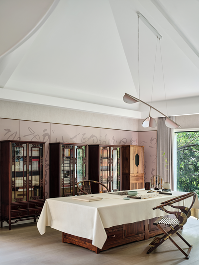 茶室拥有书卷形的屋顶,以形传神,文雅别致。茶室书桌的概念设计来自木美设计中国先锋原创家具设计师陈大瑞。