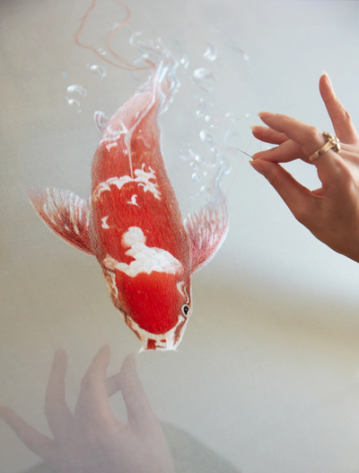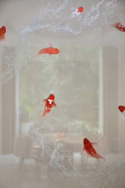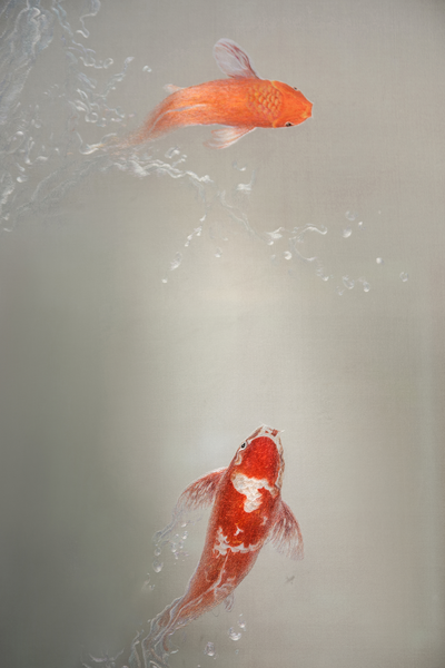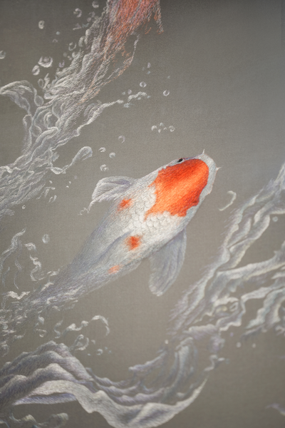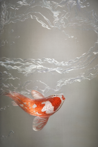 屏风画面构图疏密有致,数条锦鲤穿梭游动、栩栩如生,皆若空游无依。丝线绣出的鳞片层次分明,红白斑纹在光影下流转生辉,细细看去,连水波的颜色也是丰富的彩色。