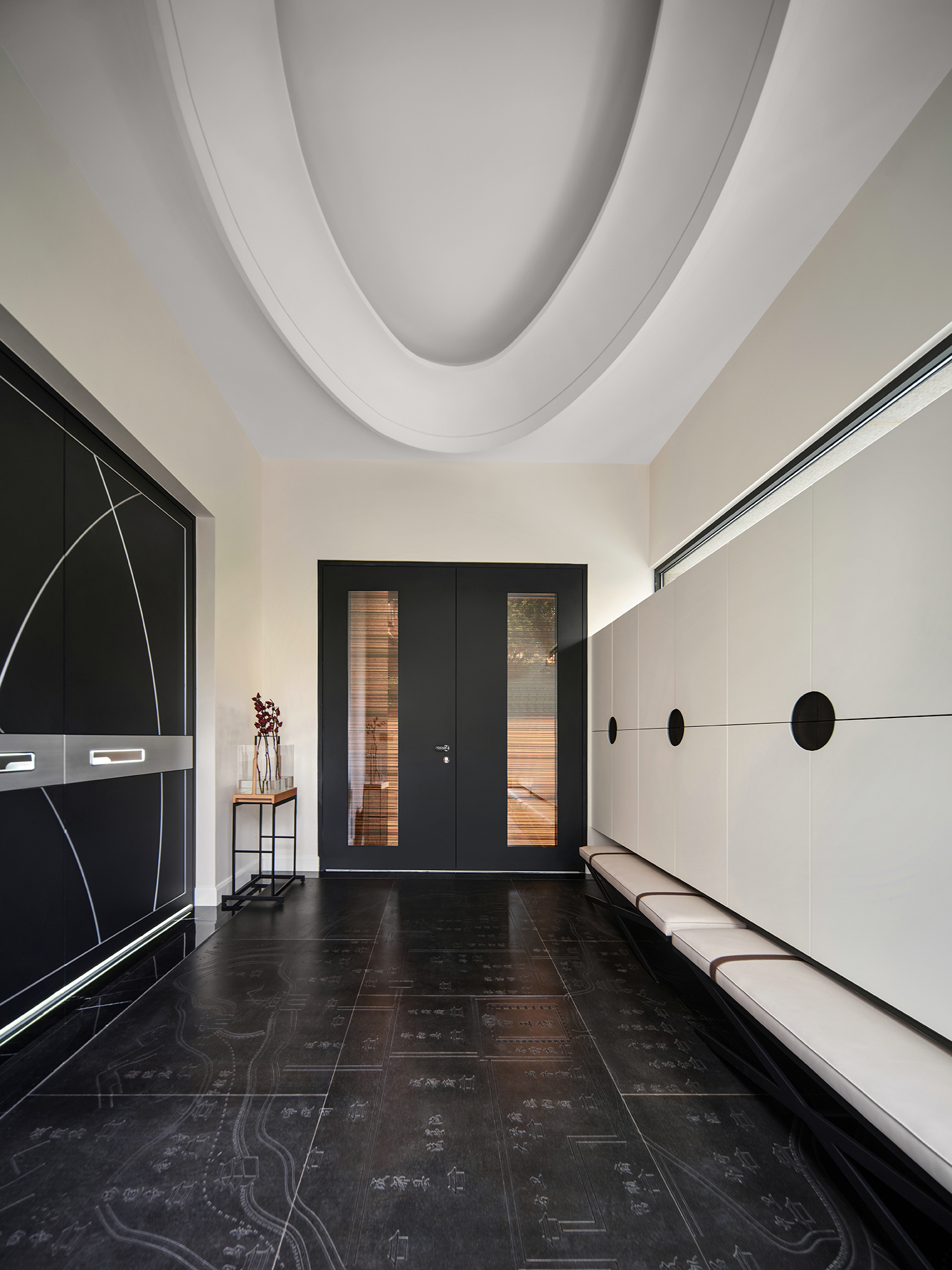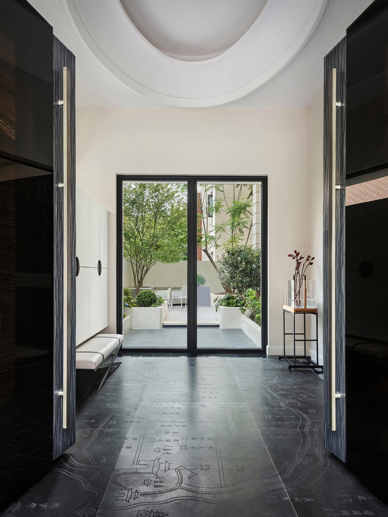 地图赫然铺陈于地,其上千载街衢宛然如生。仿佛一步踏入了时空漩涡,千年文脉与都市传奇在足下无声流淌。为呼应这一主题,门厅柜体的把手亦精心锤炼为幽微的铜扣,以细腻的质感延续着历史的对话,令每次开合都成为一次对城市文明的溯源寻根。