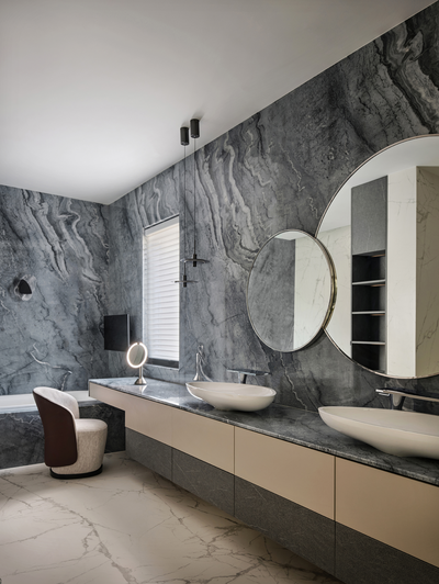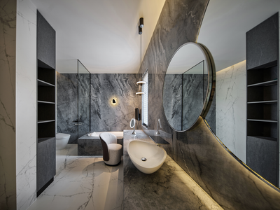 主卫考虑到男女主人不同的生活习惯和需求,通过洄游动线连接衣帽间和卧室,同时配备双台盆双马桶间设计,将收纳和私密安全性尽可能最大化,水云沙石材墙面贯穿始终,营造出水的流动之感,充满动态之美。
