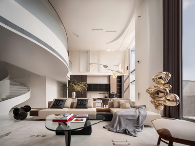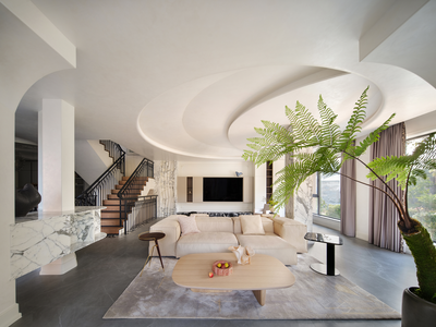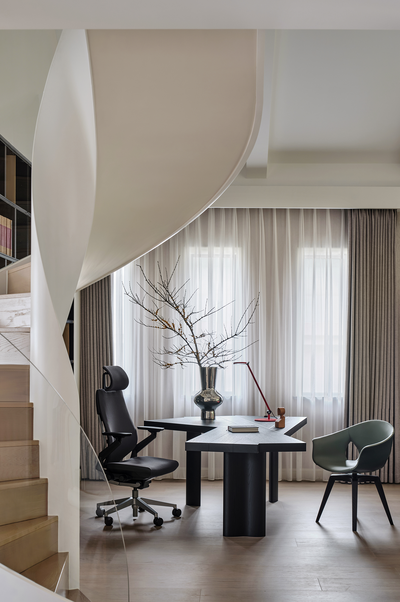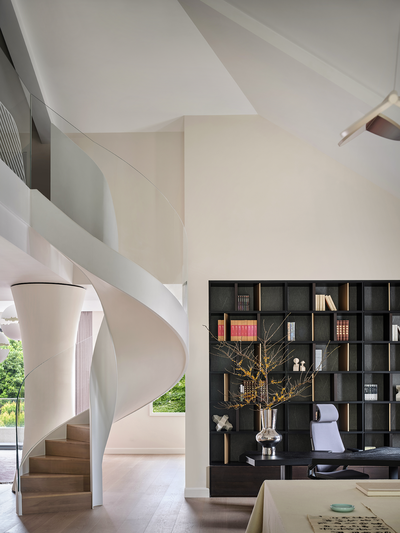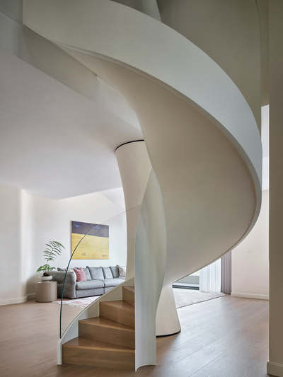 三楼家庭厅的设计核心在于通过形态、色彩与光影的互动,营造出一个松弛且富有艺术感的休憩场景,平时夫妻二人可以在这里聊天谈心。白色螺旋楼梯以其独特的波浪曲线,成为连接空间的动态雕塑,通向为女儿设计的独立趣味阁楼空间。