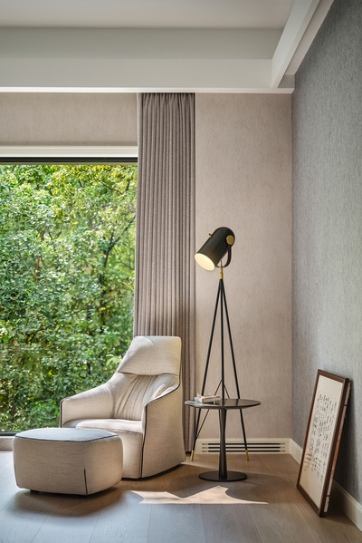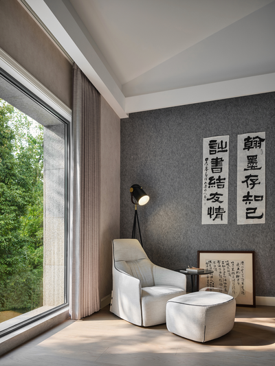 书房中的休闲角落正临窗与自然相接,翰墨书香,现代与古典,自然与人文,都在一室无声交汇,塑造兼具舒适性、功能性与精神性的当代雅士书房。