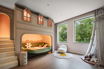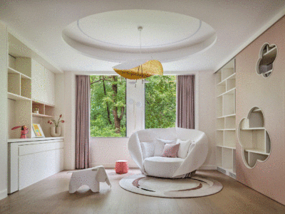 学龄前侧重安全性和趣味性,运用尖顶、拱门、爬梯、塔楼等元素为业主五岁的女儿设计了一个充满童话色彩的梦幻城堡,满足女儿的公主梦。圆弧软包设计保障女儿安全的攀爬和玩耍。选用包裹性极强的