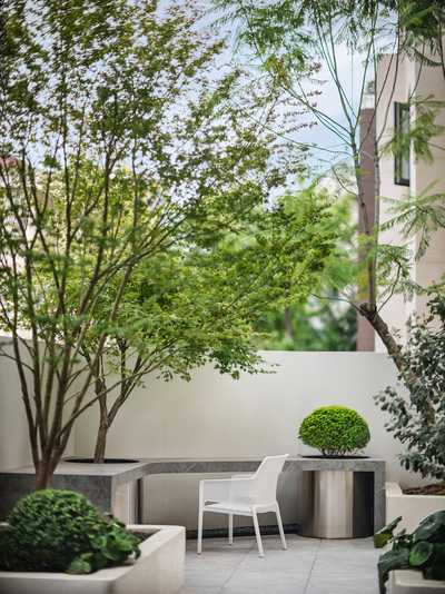 庭院中葱郁掩映,高低错落,有效保障了私属领域的宁静。并排落地窗将自然请入室内,绿意漫过窗槛,让人仿佛置身森林。内与外的界限渐渐消融,空间在呼吸中达成一种