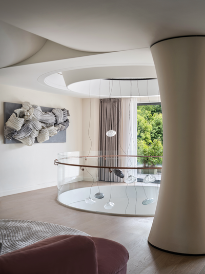 二楼的挑空圆形门厅联通露台,在楼梯去往露台的空间,同样也是和一楼圆形门厅连通的空间,垂坠的云朵状吊灯与透明金属板营造水波荡漾、水天一色的艺术意境,连通露台并延展视野。扩出的露台以错落盆栽绿植打造专属的