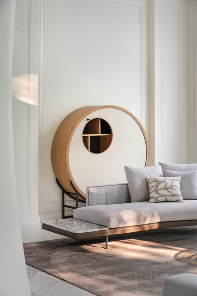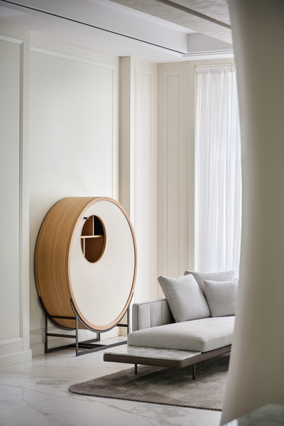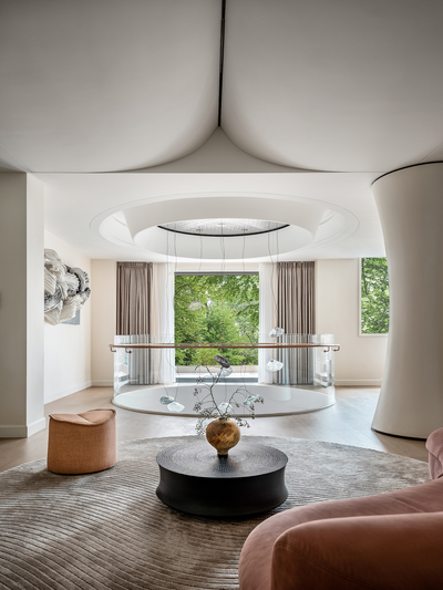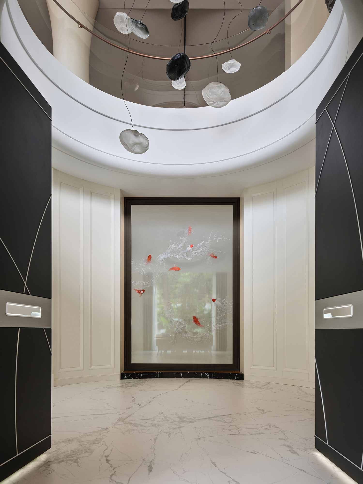 椭圆形吊顶与圆形挑空结构呼应,寓意天圆人满。圆形玄关厅借一道若隐若现的苏绣屏风与室内相连,隔而不断,透而不通,尽显虚实相生的东方美学智慧。