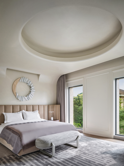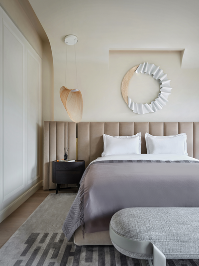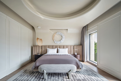 圆形元素贯穿主卧,从圆形吊顶、圆形挂饰到曲线吊灯,柔化空间线条,营造优雅柔和的视觉氛围。米色、浅灰与浅紫的温柔色调,通过织物、皮革与地毯的材质叠加,构建出细腻而富有层次的舒适感。