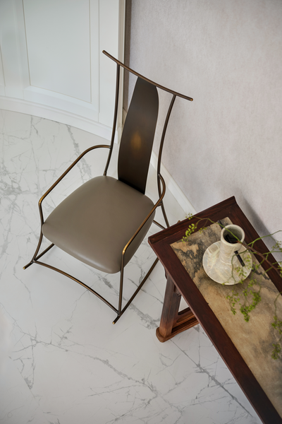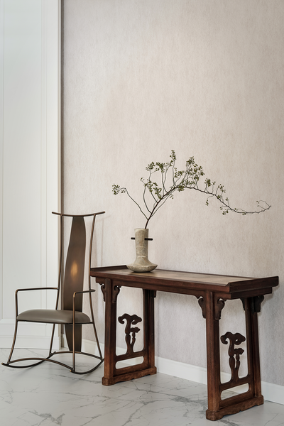 一旁长而高、窄条形的清代条几是设计师专门为空间淘来的,它以深沉的木质与含蓄的雕刻纹样,奠定了空间内敛雅致的东方基调,设计师温浩的夫子椅则展现出极简的金属弧线与现代质感,二者一同实现了传统与现代的巧妙对话。