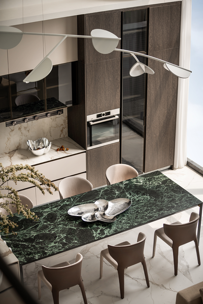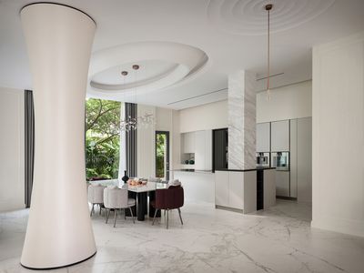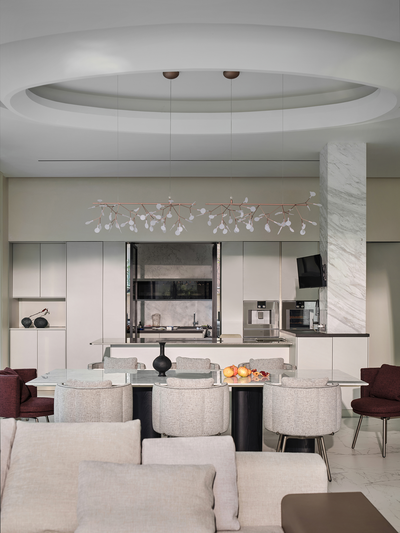 将原有结构柱巧妙包裹,使其融入厨房并成为空间的自然过渡。餐厨区与客厅无界相连,开阔通透,透过落地窗与室外绿意相互映衬。