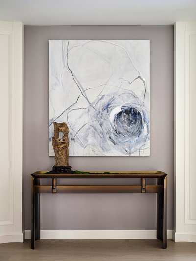 玄关前的条桌也出自家具设计师温浩之手。铜制玄关台,铺满玄色石子,太湖石与苔藓交融,生机盎然、趣味横生。画作出自青年画家张妮,画面中有一个像玫瑰的鸟巢,远距离看还能看到具象的蛋,色调典雅,融合了传统中国写意与生态自然观。