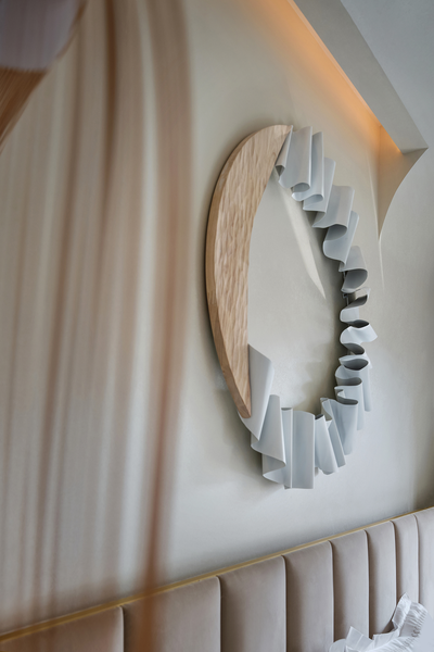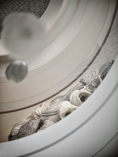 空间以弧线为语言,构建出一场关于轻与重的对话。纸艺艺术装置《云絮》通过灰白渐变的层次与丰富的褶皱肌理,模拟了自然界的流动感,为空间注入了柔和的动态韵律。