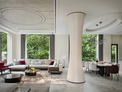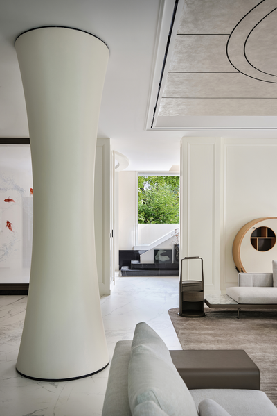 曲线柱体。既延续了现代建筑的凝练与精确,又融入了东方美学中含蓄流动的意境。柱身由下至上渐收再微展,如同自然生长而出,弱化了原有结构的生硬感,将空间支撑得既圆融又通透,中西之美在此落地生根。