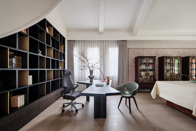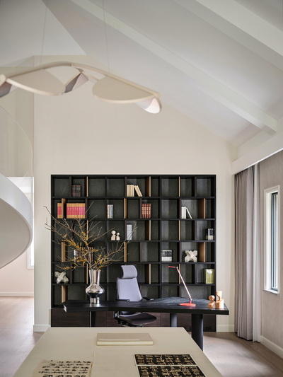 女主人的书房以现代设计手法融合中式意蕴,黑色蝴蝶翼形书桌拥有利落的几何切割,硬朗质感并存。整面墙的书架大气有序,兼具收纳和展示功能。
