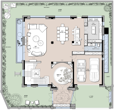 侧花园以绿植与石材营造宁静氛围,融入小型水景与休憩区。绿意透过落地窗延伸至室内,形成建筑与自然的视觉连续。通过模糊边界,将自然转化为空间元素,让人在流水与光影中感受与环境的共生。