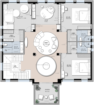 家的温度,在于对每一份需求的细致关照,二楼是专为四位老人和一个女儿设计的休息活动空间。老人房采用适老化设计,是对长者身心需求的尊重与安抚,让他们静享天伦之乐;女儿房预留的成长性,则是对孩童探索世界的好奇心与独立意识的呵护。