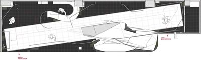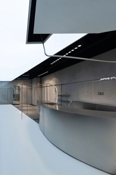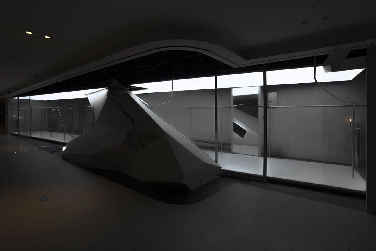 At the core of the space is a huge geometric volume that seems to have burst into the interior from the outside. It is sharply cut into a polyhedral shape, like a fragment of a futuristic aircraft, forcefully intervening into the neutral space.