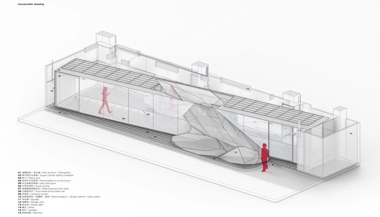 A venue for both the wholesale and retail of clothing that combines the functions of display, performance, and communication, folded between geometric cuts and the interplay of reality and illusion.