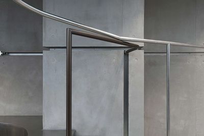 材质的对比为空间注入了冷峻的张力。核心几何构筑物采用灰白色石材表面,犹如被切割的巨石,以坚硬而纯粹的肌理成为空间的视觉核心。墙面由混凝土与镀锌板凹槽分割,呈现出粗粝与精致的并置关系。不锈钢管则贯穿全场,构成挂衣与分隔的系统性结构,赋予空间工业化的骨架感。芝麻黑地面以深沉的质感承托整体,使上方的服装与几何体更显突出。