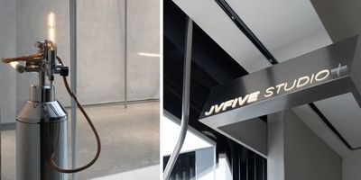 Oxygen cylinder lighting installation and brand signage that echoes spatial language