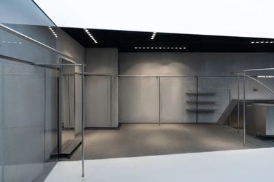 Linear rods throughout the space further reinforce this logic. As clothing racks, they not only fulfill a display function but also create lightweight boundaries and an interplay of reality and illusion within the space. Clothing floats, falls, and hovers on the rods, both concealing and showcasing, allowing the space’s layers to shift with the arrangement of the displays